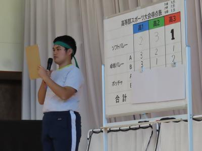 11月28日㈮、高等部ではスポーツ大会を開催しました。ソフトバレー、卓球バレー、ボッチャ、ダンスの4種目を行い、生徒たちは互いに声を掛け合いながら全力で競技に取り組みました。ボールを真剣に見つめる表情、勝利を喜ぶ笑顔など生徒一人一人の輝く姿がたくさん見られました。 開閉会の運営は、集会・体育・放送委員会が中心となって進行し、競技や会場準備、片付けも生徒たちが協力して行い、自分たちで作ったスポーツ大会となりました。