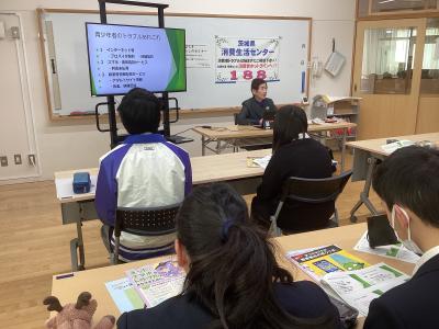 まもなく卒業を迎える3年生は、茨城県消費生活センターの講師をお招きして、くらしのセミナーを受講しました。スマホやタブレット端末を使った詐欺や勧誘など様々な方法で騙されてしまうケースをたくさん教えていただきました。どうすればよいか困ったときには、親や先生、消費生活センターに相談すること、そして大切なことは自分の「命」を守ることを教えていただきました。