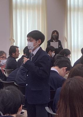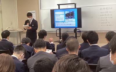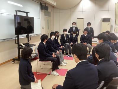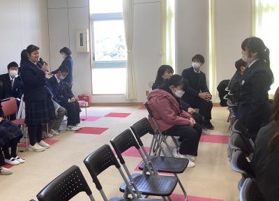 2/18㈭高等部全体で進路報告会を行いました。高等部3年生が自分の進路、今まで頑張ってきたこと、自分の夢、後輩へのメッセージを発表しました。発表後、後輩からは様々な質問があり、それに自分なりに考えしっかりと返答している姿からこの3年間の成長が感じられました。高等部3年生からの言葉は、在校生にとって将来を具体的に考える大きなきっかけになったり、「自分は何を頑張ろうか」と考えたりすることができた大変有意義な時間となりました。