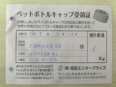 一覧へ 1. 高等部ペットボトルリサイクル活動報告 投稿日時: 11/27 菅谷和寿 高等部の職業(実技)のライトワークグループや校内実習において、使用済みのペットボトルを分別するリサイクル作業に取り組んでいます。 このたび、生徒たちが集めたキャップが6㎏になり、企業へ届けたところ、ポリオワクチン3名分に相当する支援につながりました。目に見える形で社会に貢献できたことは生徒たちにとって大きな励みになります。今後もこの活動を続けていきたいと思います。