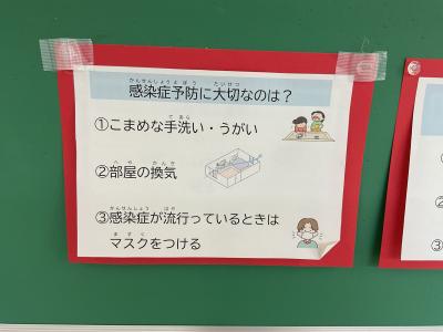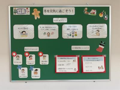 かぜやインフルエンザなどの感染症が流行しています。寒い冬を元気に過ごすために、規則正しい生活、手洗いうがい、栄養バランスの取れた食事、換気などを日頃から意識して、予防しましょう!