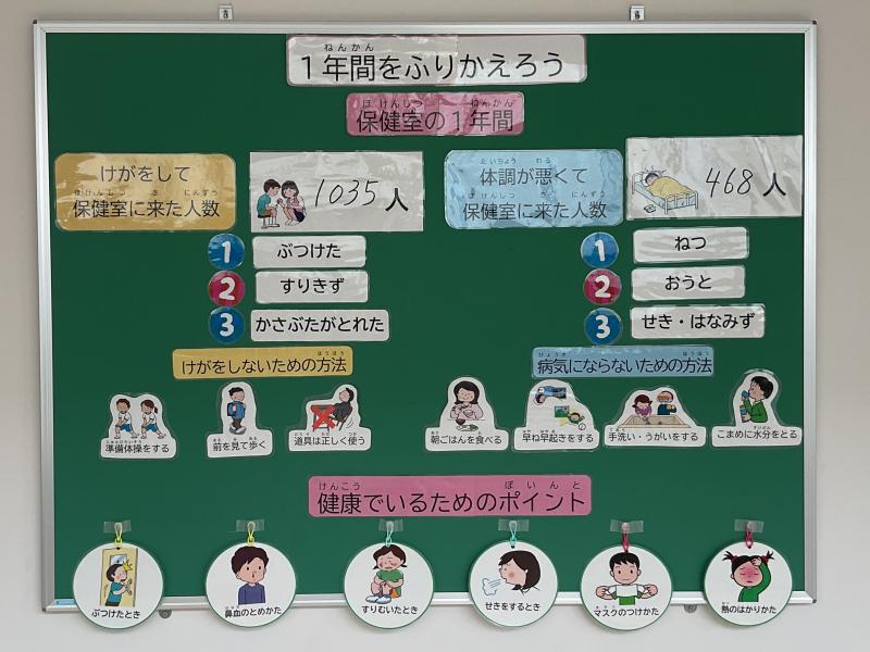 今月は保健室の1年間について振り返りをしました。健康でいるためのポイントについて学ぶことができます。今年も大きなけがや事故がなく過ごすことができました。けがや病気は予防することができます。安全に気を付け、生活習慣を整えて来年度も元気に過ごしましょう。